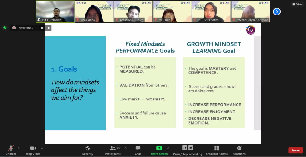 Webinar yang hanya terbuka untuk anggota ASAP sendiri ini mengangkat tema pengembangan diri dengan menumbuhkan mindset positif pada individu. ASAP mengundang salah satu dosen Psikologi Klinis Fakultas Psikologi UNAIR, Afif Kurniawan, M.Psi., Psikolog, untuk menjadi key speaker di webinar kali ini. Selama kurang lebih satu jam, Pak Afif memberikan materi tentang kesehatan mental, bagaimana cara meningkatkan self-esteem diri sendiri, dan juga growth mindset – sebuah konsep pemikiran yang harus diterapkan agar seorang individu bisa berkembang. Pemaparan materi kemudian dilanjutkan dengan sesi tanya jawab selama lima puluh menit yang diikuti dengan antusias oleh peserta.