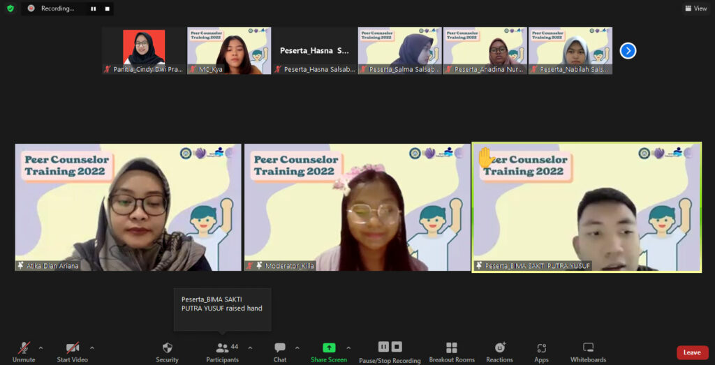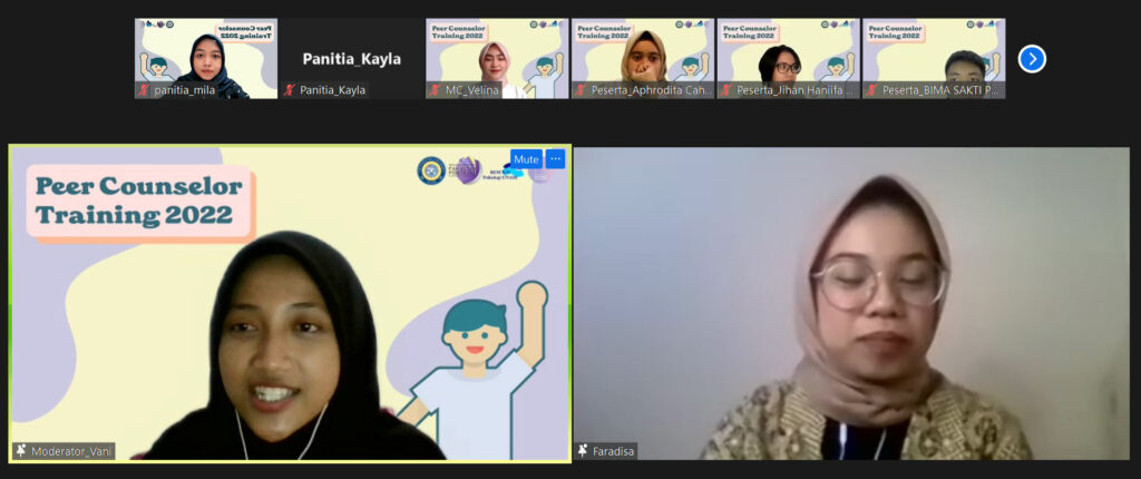 Hari terakhir Peer Counseling Training diisi dengan kegiatan diskusi FGD dan roleplay. Mekanisme FGD diikuti oleh peserta dengan dibagi perkelompok dan dilakukan di breakout zoom masing-masing. Ketika sesi FGD berlangsung tiap kelompok ditemani oleh satu orang fasilitator dan satu orang notulen dari panitia. Sedangkan sesi roleplay terdiri dari dua sesi yaitu roleplay berpasangan dan roleplay via chat yang dilakukan dengan mengisi g-form. Seluruh rangkaian PCT 2022 berjalan lancar dan sukses. Para peserta pun memberikan testimoni dan komentar positif mengenai kegiatan pelatihan ini. Seperti salah satu testimoni yang mengatakan “terima kasih sudah mengadakan peer counselor training. Alhamdulilah materi yang diberikan, cara penyampaian, konsep pelatihannya sesuai dengan apa yang dibutuhkan. Dari trainer dan fasilitator saat FGD dan Roleplay juga terima kasih. sudah memberikan materi dan evaluasi yang membangun. Mantap.”