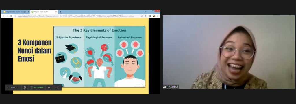 Pada sesi kedua materi tentang regulasi emosi, dijelaskan bahwa kebanyakan orang seringkali menerjemahkan emosi sebagai perilaku marah. Padahal, hal ini merupakan sebuah mispersepsi yang sudah sepatutnya diluruskan. Emosi pada dasarnya adalah sebuah reaksi yang ditunjukkan oleh tubuh baik dalam bentuk perilaku maupun ekspresi wajah terhadap suatu stimulus dari lingkungan sekitar. Pembahasan tentang emosi lengkap disampaikan oleh pembicara hingga di akhir pembahasan pemateri juga memberikan tips bagi kita untuk dapat lebih mahir meregulasi emosi. Setelah pemaparan kedua materi, diadakan sesi tanya jawab yang dipandu oleh moderator. Sesi tanya jawab berlangsung cukup seru. Banyak sekali hal yang dieksplorasi oleh peserta di sesi tanya jawab.