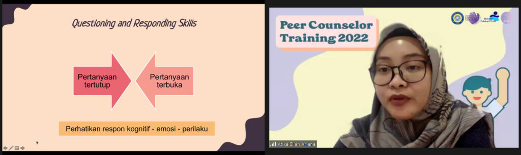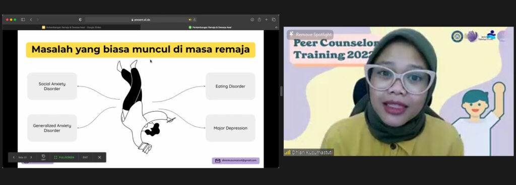 Peer Counseling Training hari pertama berisi pemaparan dua materi yaitu mengenai materi perkembangan remaja dan dewasa awal yang diberikan oleh Dhian Kusumastuti, S.Psi. dan materi regulasi emosi yang diberikan oleh Luthfah Naily Faradisa, S.Psi.. Pada sesi materi perkembangan remaja dan dewasa awal dijelaskan bahwa kita sebagai manusia pasti bertumbuh dan berkembang ditandai dengan bertambahnya umur kita setiap tahunnya. Tingkat usia yang berbeda menunjukkan perbedaan tugas perkembangan yang harus diselesaikan di tiap tahapnya. Pada sesi materi ini, pembahasan terfokus pada dinamika perkembangan remaja dan dewasa awal. Mulai dari karakteristiknya masing-masing, masalah kesehatan mental yang mungkin terjadi di tahap ini beserta faktornya, dan juga tips bagi calon konselor saat menghadapi klien. Di akhir, pemateri menekankan bahwa harapannya, dengan mengetahui tahap perkembangan ini lebih dalam, peserta dapat menumbuhkan rasa empati yang lebih besar.