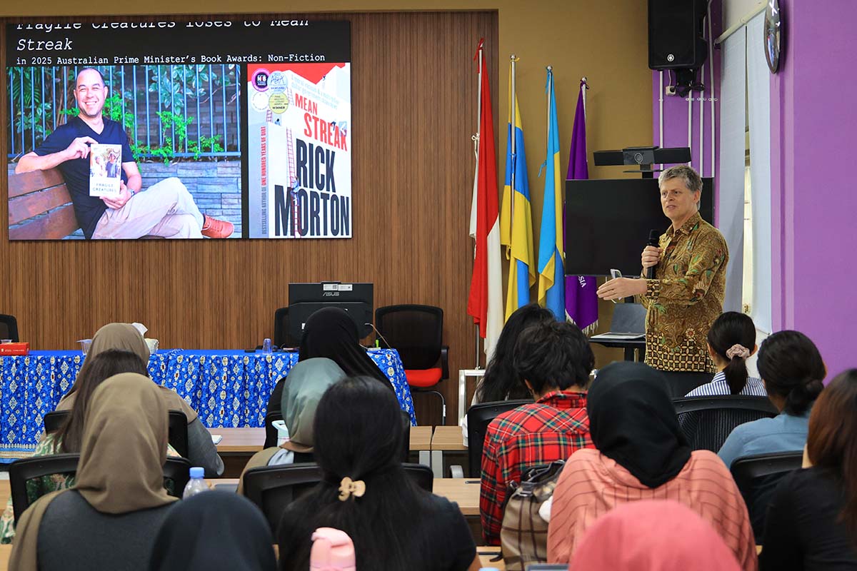 Acara dilanjutkan dengan Public Lecture pada pukul 14.45 WIB, yang menghadirkan narasumber utama, Dr. Thor Kerr dari Curtin University. Dengan topik menarik “Shaping Minds: The Role of Media in Advancing Mental Health Promotion,” Dr. Kerr memaparkan bagaimana media memiliki peran krusial dalam membentuk kesadaran, mengubah sikap, dan memengaruhi perilaku publik menuju masyarakat yang lebih sehat mental. Dalam sesi ini, peserta terlibat aktif melalui diskusi dan tanya jawab yang mengedepankan isu-isu terkini yang terjadi di sekitar kita, khususnya terkait peran media dan dampak yang dihasilkan.