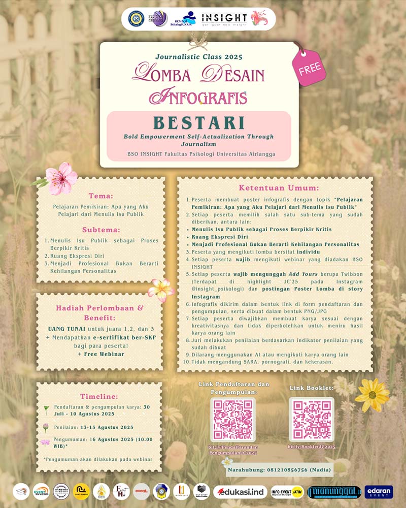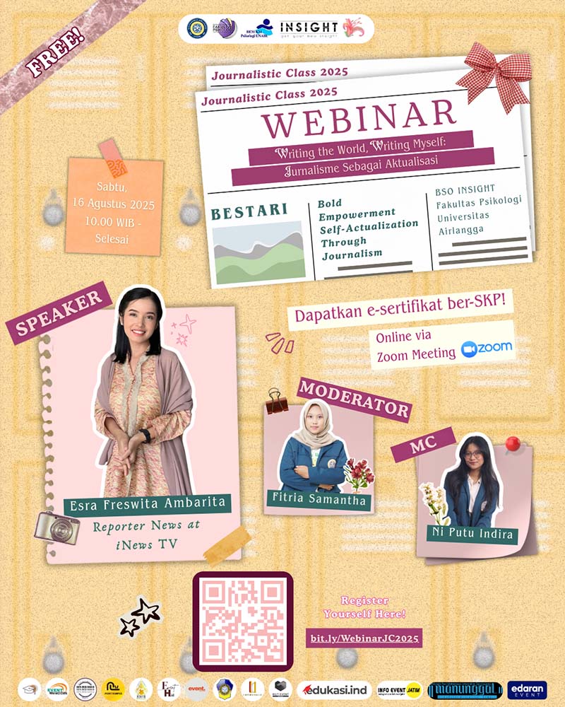 Informasi yang lebih aksesibel di masa kini menjadi sebuah hal yang signifikan bagi masyarakat dalam mengolah apa yang mereka terima dalam menerima informasi pula. Maka dari itu, penting adanya dalam memperhatikan informasi yang kredibel, edukatif, dan inklusif bagi segala kalangan. Untuk itu, jurnalisme dan peliputan memegang salah satu kepentingan dalam pertanggungjawaban informasi yang tersebar di kalangan masyarakat. Berdasarkan hal tersebut, BSO Insight Fakultas Psikologi Universitas Airlangga mengadakan kegiatan Journalistic Class 2025.