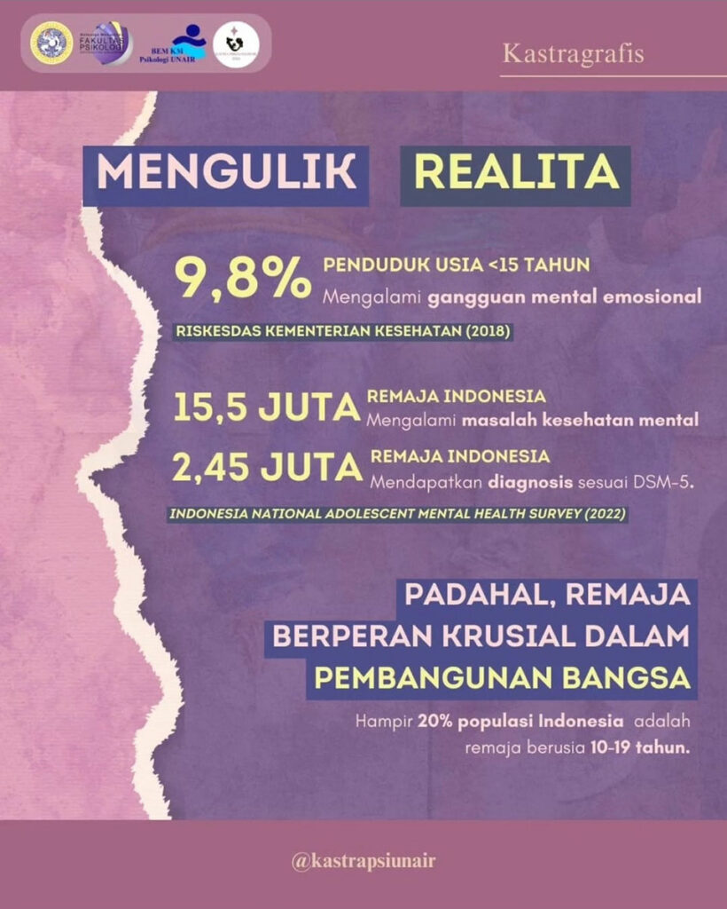 Kastragrafis #5 menyoroti fenomena memprihatinkan di Indonesia terkait maraknya kasus gangguan mental yang terjadi pada generasi muda. Padahal semestinya generasi muda inilah yang akan membawa Indonesia menjadi Indonesia Emas seperti yang sudah digadang-gadangkan oleh pemerintah. Lalu seperti apa upaya pemerintah untuk mewujudkan harapan tersebut? Apakah “Indonesia Emas” selamanya akan tetap menjadi mimpi semata?