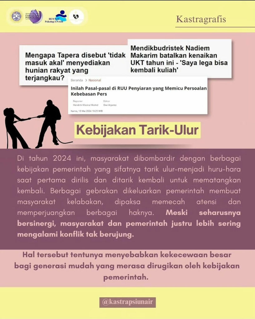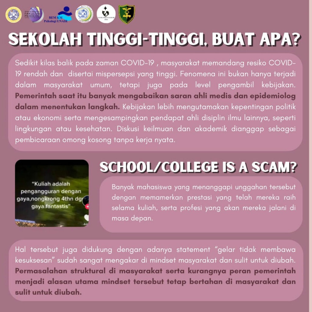 Maraknya konten-konten yang memberi konotasi negatif terhadap “mahasiswa” dan “kuliah” di media sosial membuat adanya pergolakan tersendiri terutama pada kalangan mahasiswa itu sendiri. Berkolaborasi dengan Kastrat BEM KM Fakultas Kedokteran Universitas Airlangga, Kastragrafis #2 mewadahi segala bentuk argumen dan data untuk dipublikasikan ke khalayak umum dengan harapan dapat mematahkan stigma-stigma yang sedang banyak menjadi perbincangan.