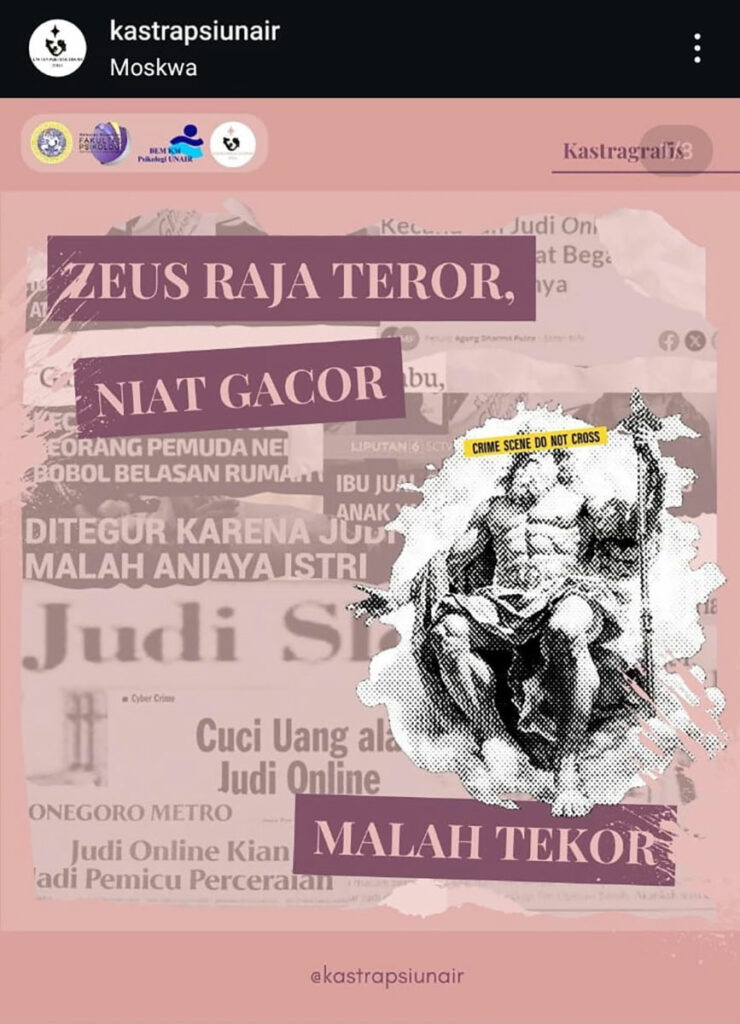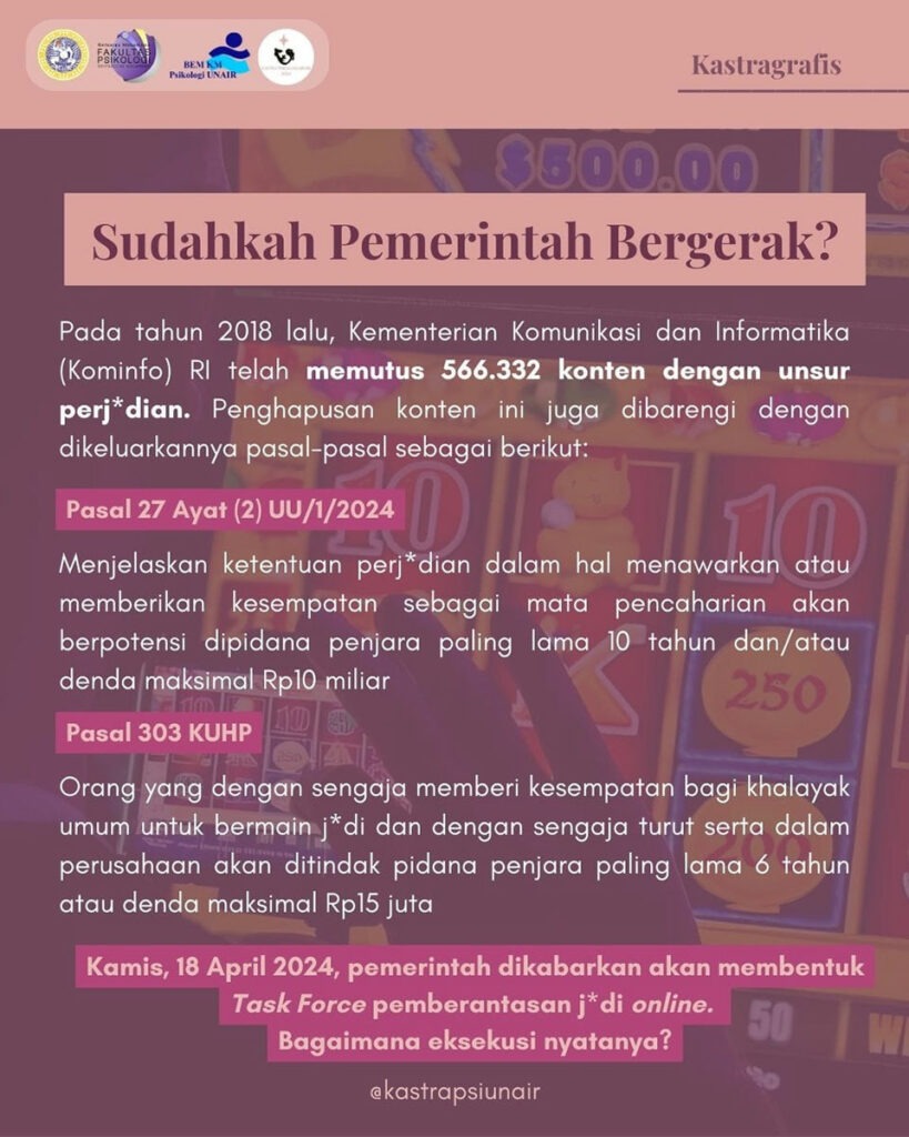 Pada bulan Juli 2024, masyarakat Indonesia banyak mendapat SMS Blast yang berasal dari KOMINFO RI. SMS yang berisi pantun singkat dengan intensi “mengimbau” rakyat agar tidak melakukan judi online rupanya ramai disorot di berbagai platform. Kastragrafis #3 ini membawakan perspektif psikologis terkait adiksi dari judi online sekaligus mengkaji sejauh mana kebijakan pemerintah dalam menanggulangi permasalahan tersebut.Apakah dengan spamming SMS pantun ke seluruh penjuru Indonesia sudah cukup efektif?