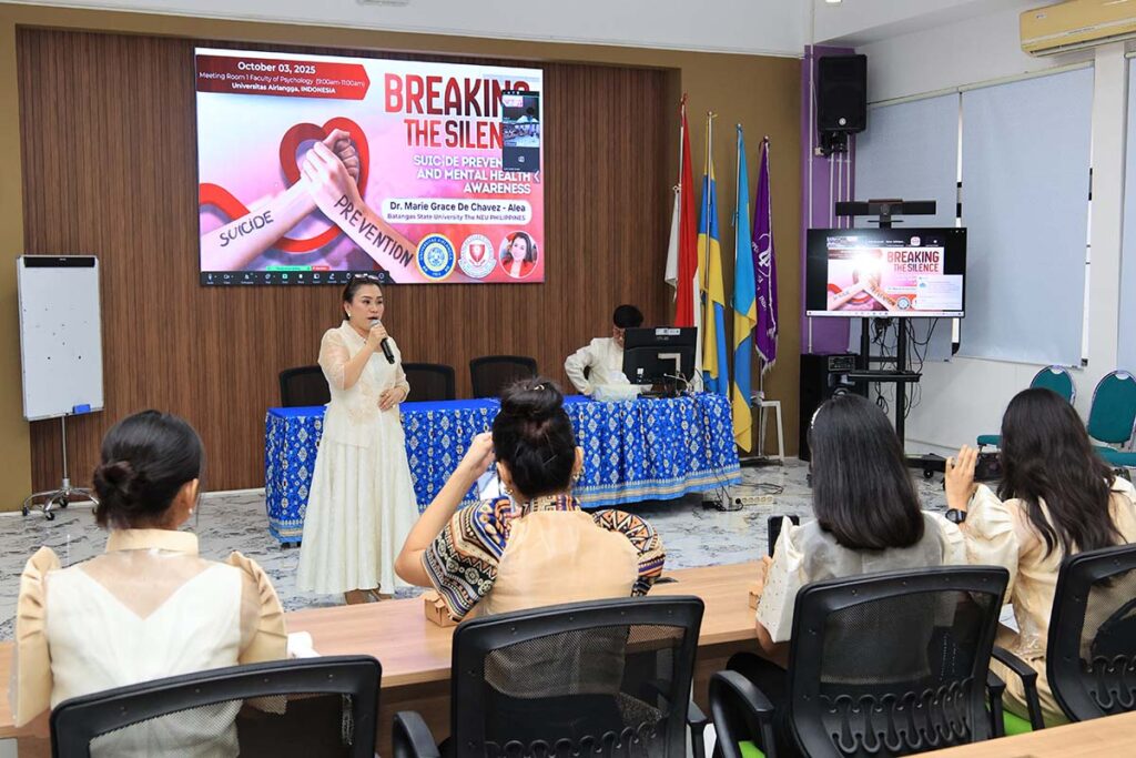 Acara inti berupa guest lecture, membahas topik krusial: “Breaking the Silence: Suicide Prevention and Mental Health Awareness”. Sesi kuliah tamu ini disampaikan langsung oleh pakar dari Batangas State University, Dr. Marie Grace De Chavez-Alea. Kuliah tamu ini diwajibkan bagi mahasiswa yang mengambil mata kuliah kesehatan mental pada program IUP (International Undergraduate Program) dan terbuka bagi dosen Fakultas Psikologi UNAIR serta peserta umum lainnya yang tertarik pada isu kesehatan mental. Total peserta yang hadir dalam kegiatan yang dilaksanakan secara hybrid ini melebihi ekspektasi penyelenggara, dimana lebih dari 100 orang hadir untuk menyimak pemaparan dari Dr. Marie Grace De Chavez-Alea.