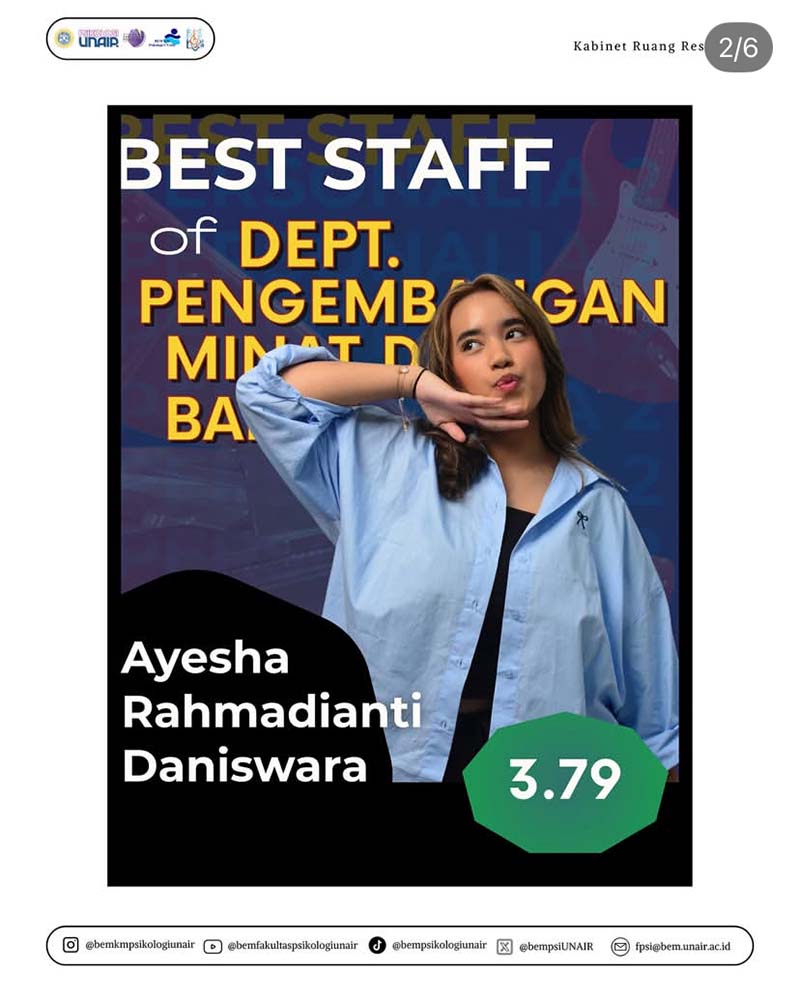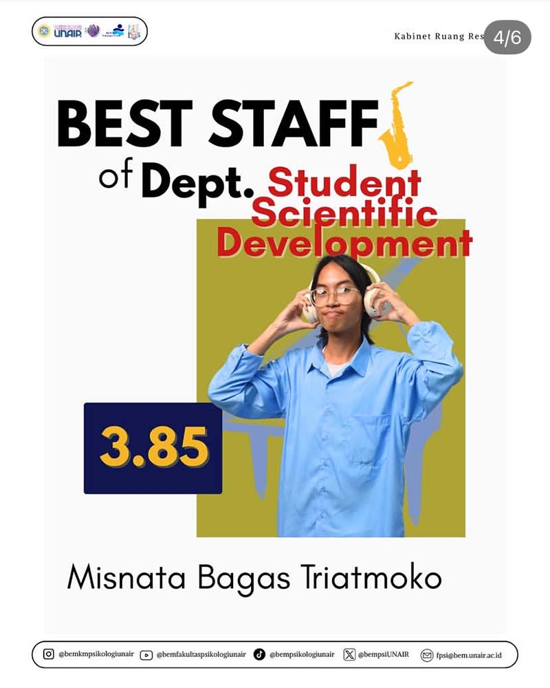 Banyak cara yang bisa dikembangkan oleh individu untuk melangkahkan kakinya ke garis akhir. Dalam tingkat Fakultas Psikologi Universitas Airlangga, BEM Keluarga Mahasiswa (KM) hadir dalam bentuk organisasi yang siap memfasilitasi KM untuk berkembang. Akan tetapi tidak hanya memfasilitasi KM untuk berkembang, anggota BEM KM juga berkesempatan dalam berprogres bersama Kabinet Ruang Resonansi. Badan Pengembangan dan Penjaminan Mutu Organisasi (BPPMO) menyediakan sarana bagi anggota BEM KM Kabinet Ruang Resonansi dengan program kerjanya, salah satunya Personalia. Personalia hadir dalam bentuk penilaian sebagai evaluasi, pantauan, dan pengelolaan sumber daya manusia. Dengan penilaian 360 degree feedback, pertanyaan-pertanyaan disusun melalui dimensi dan indikator berdasarkan kamus kompetensi Harvard, British, dan Organizational Readiness Office. Melalui mekanisme ini, Personalia tidak hanya berfungsi sebagai alat ukur kinerja, tetapi juga sebagai ruang refleksi kolektif untuk menumbuhkan kesadaran diri, akuntabilitas, dan budaya pengembangan berkelanjutan di dalam organisasi yang sejalan dengan tujuan Sustainable Development Goals (SDGs) poin 4 (Quality Education).
