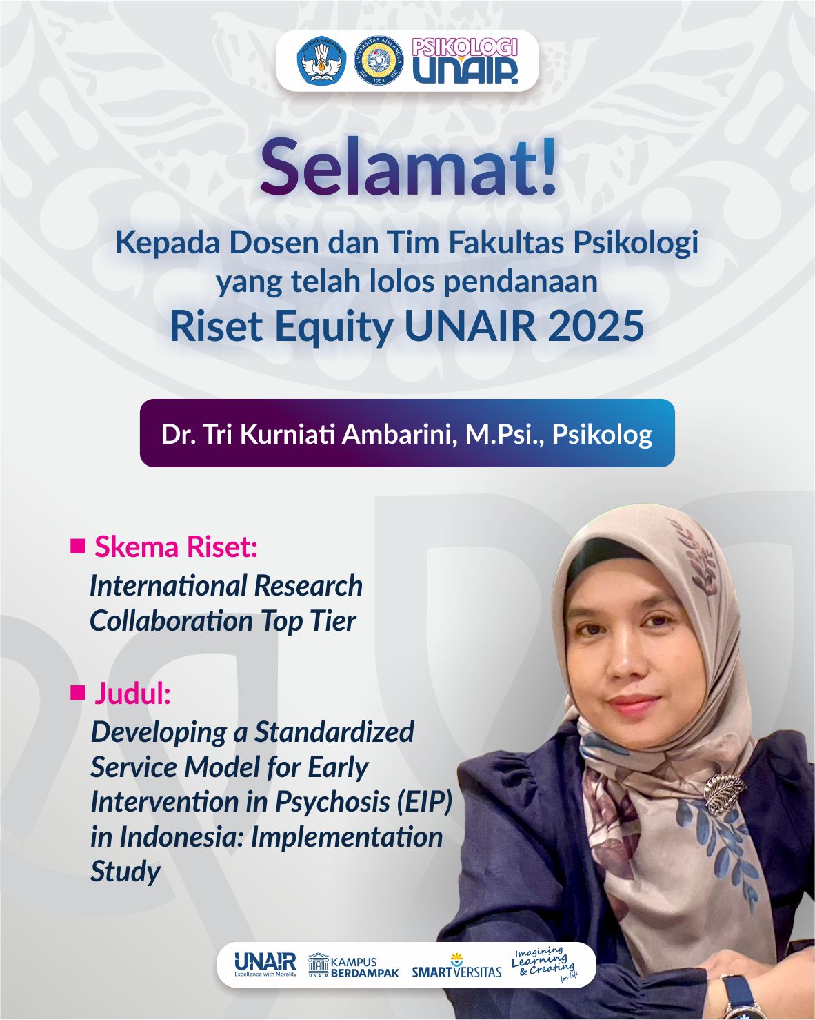 Fakultas Psikologi Universitas Airlangga menyampaikan apresiasi sebesar-besarnya kepada para dosen dan tim peneliti yang telah berhasil meraih pendanaan Riset Equity UNAIR 2025. Keberhasilan ini mencerminkan kontribusi signifikan fakultas dalam memperkuat riset berbasis kolaborasi dan berdampak pada masyarakat, selaras dengan komitmen UNAIR terhadap SDG 3 (Good Health and Well-Being), SDG 4 (Quality Education), dan SDG 17 (Partnerships for the Goals).