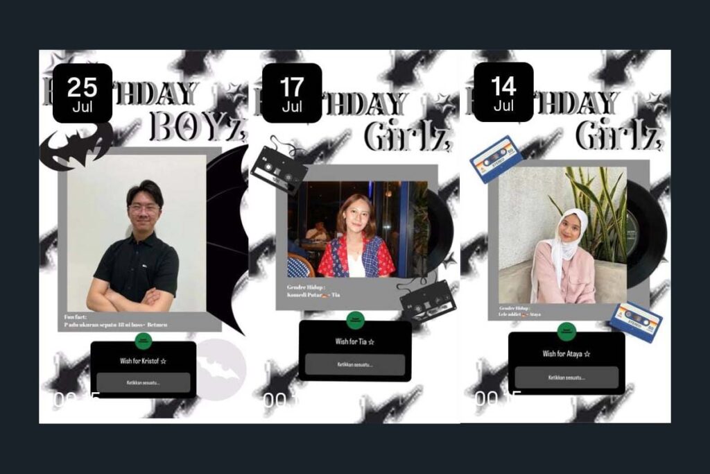 Pada dasarnya, Wellbeing Program menyatukan berbagai komponen yang bertujuan untuk meningkatkan kebahagiaan dan hubungan anggota BEM KM Psikologi Universitas Airlangga. Terdapat beberapa program yang dirancang untuk meningkatkan kebahagiaan dan hubungan anggota BEM KM diantaranya ucapan selamat ulang tahun. Mengucapkan ulang tahun dilakukan untuk merayakan hari istimewa setiap anggota sehingga mereka merasa dihargai dan diakui dalam BEM KM. Selain itu, tulisan apresiasi juga ditampilkan secara teratur dalam mengakui pencapaian dan kontribusi individu serta memperkuat budaya pengakuan dan rasa terima kasih. Terakhir, kegiatan bonding yang akan dilaksanakan 3 kali selama masa periode untuk mendorong kekompakan dan persahabatan tim serta memberikan kesempatan bagi anggota untuk terhubung secara pribadi di luar tanggung jawab profesional mereka. Bersama-sama, komponen-komponen ini membentuk pendekatan holistik terhadap kesejahteraan anggota, mendorong rasa memiliki, penghargaan, dan mempererat hubungan interpersonal dalam BEM KM Psikologi Universitas Airlangga sehingga SDGs good health and well-being tercipta di lingkungan BEM KM Psikologi Universitas Airlangga.