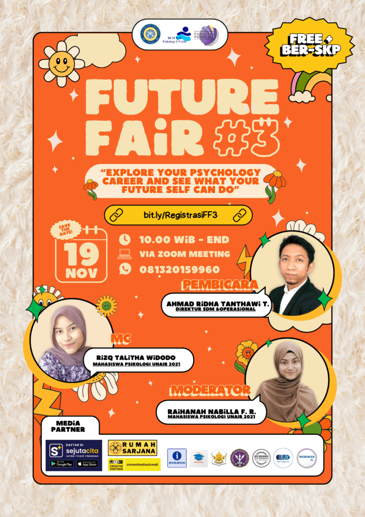 Tenang! Departemen HRD X SSD BEM KM Psikologi Universitas Airlangga punya solusinya! Masih ingat kan dengan Future Fair Series yang sudah kita lalui sebelumnya? Kali ini Future Fair Series kembali hadir dengan konsep dan tema yang baru, yaitu “Future Fair III: Explore Your Psychology Career and See What Your Future Self Can Do”