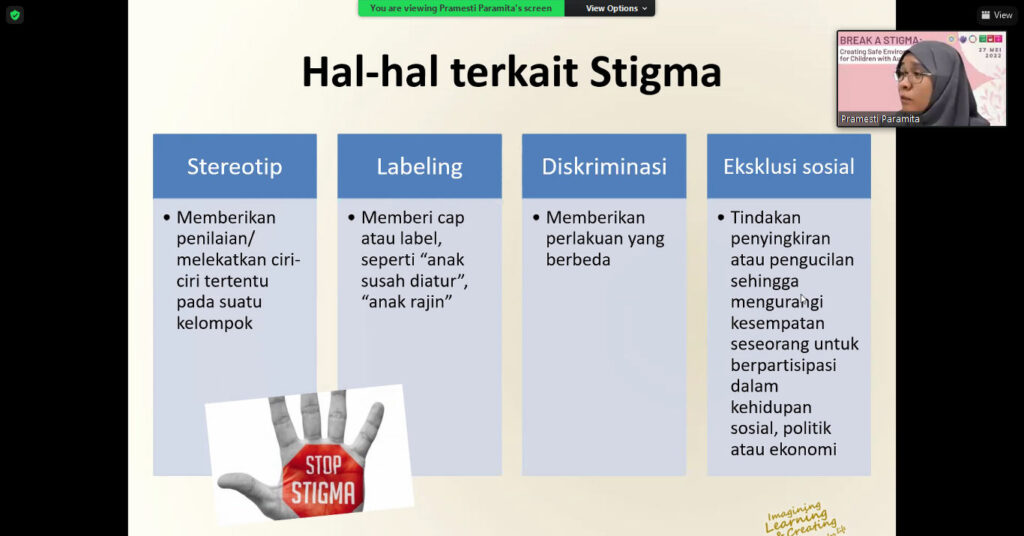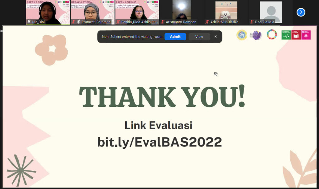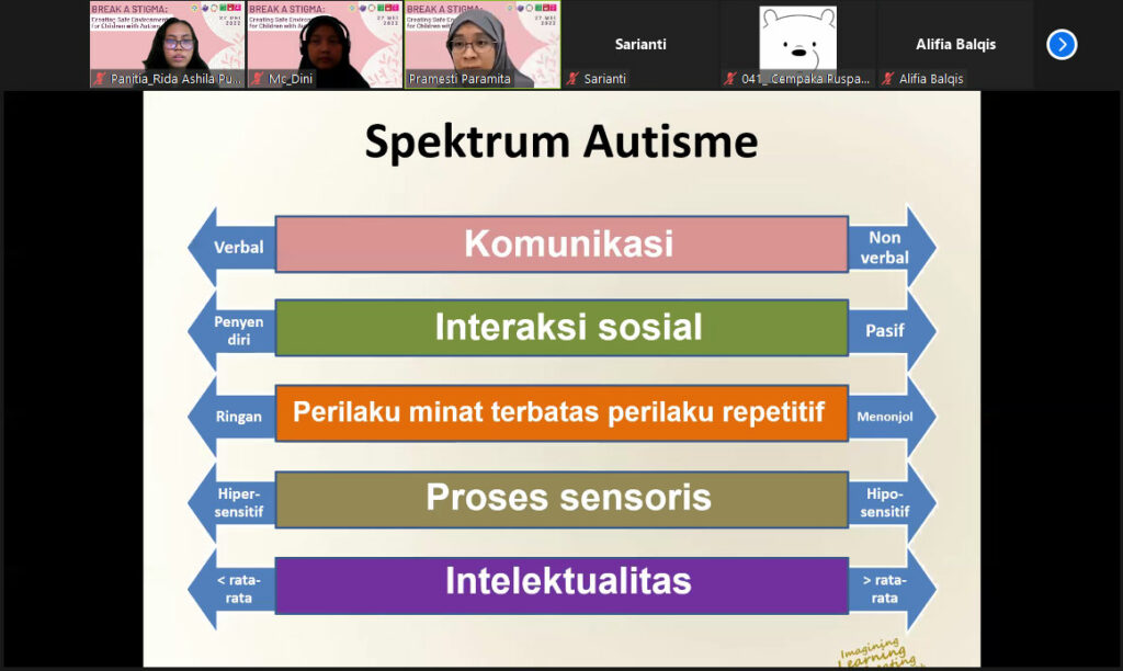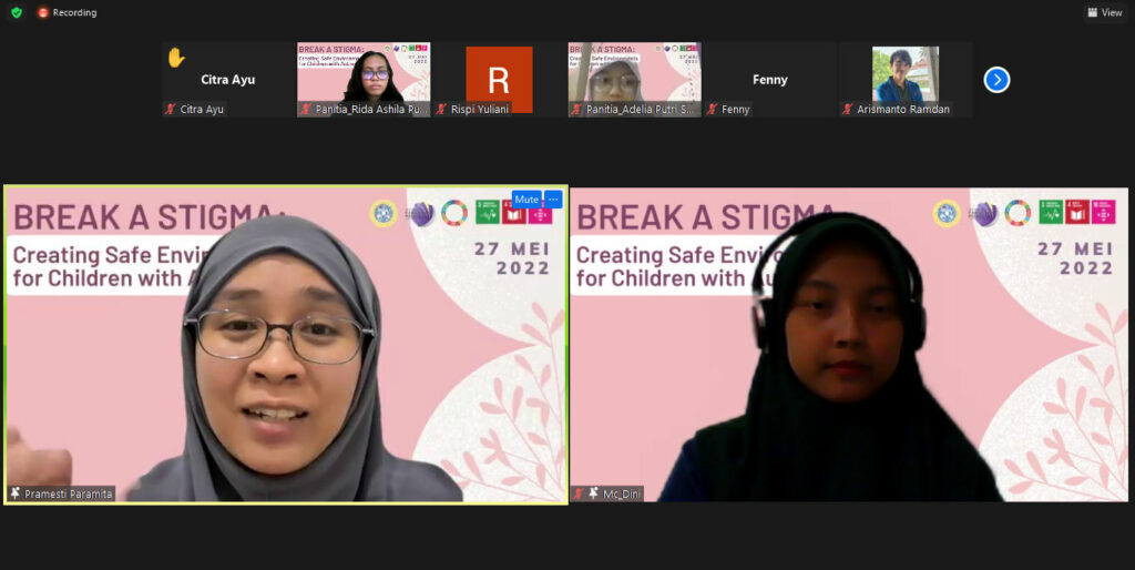 Sebagai bentuk kontribusi guna tercapainya Sustainable Development Goals (SDGs) no 3, 4, dan 10 serta untuk mematahkan stigma terhadap anak dengan autisme, kami mengadakan suatu kegiatan psikoedukasi yang dilaksanakan melalui webinar dengan judul “Break A Stigma: Creating Safe Environment for Children with Autism” pada hari Jumat, tanggal 27 Mei 2022. Adapun penyusunan acara ini terbagi ke dalam tiga tahapan, yaitu tahap persiapan, tahap pelaksanaan, dan tahap evaluasi. Tahap persiapan dimulai dengan pengumpulan data terkait kasus anak dengan autism spectrum disorder di media massa. Tujuannya adalah untuk mengetahui hal apa yang kerap menjadi masalah pada anak dengan ASD. Setelah data didapatkan dan diketahui bahwa masalah yang masih sering terjadi adalah pemberian stigma pada anak ASD sehingga topik tentang stigma pada anak dengan ASD. Setelah menentukan topik, kami merancang kegiatan, menyebar poster, membuat link pendaftaran melalui g-form serta grup Whatsapp untuk mengkoordinir peserta, mengajukan surat permohonan narasumber, dan mempersiapkan hal-hal lain yang diperlukan untuk mendukung kelancaran kegiatan.