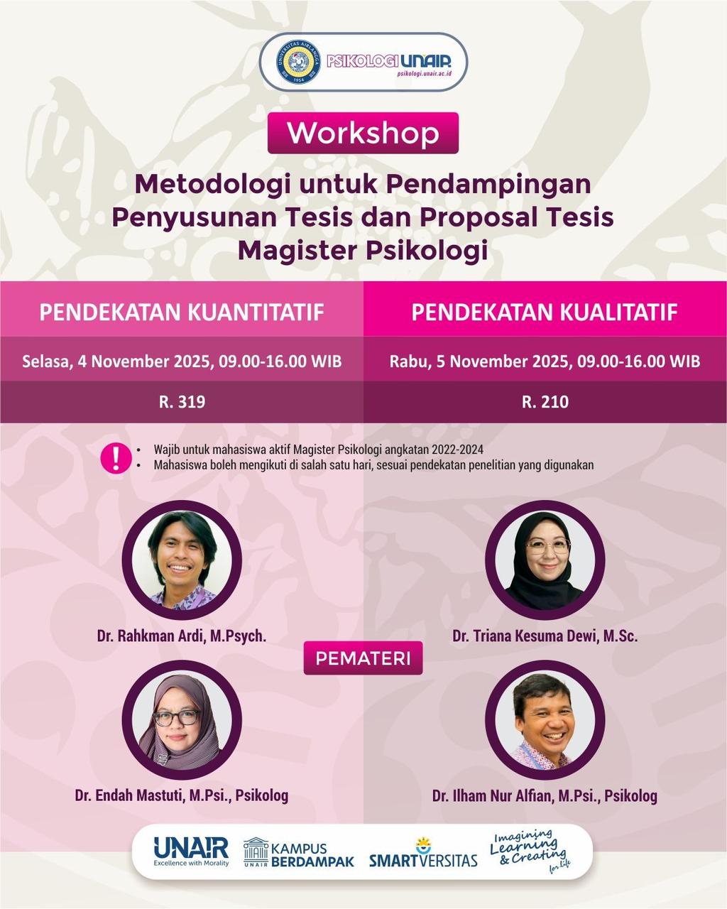 Melalui workshop ini, Magister Psikologi UNAIR menunjukkan komitmennya untuk mencetak lulusan yang profesional, memiliki kompetensi metodologi yang kuat, dan mampu berkontribusi pada pengembangan ilmu pengetahuan di bidang psikologi. Antusiasme mahasiswa terlihat jelas, menandakan kesiapan mereka untuk segera memulai atau menuntaskan proyek penelitian tesis mereka.