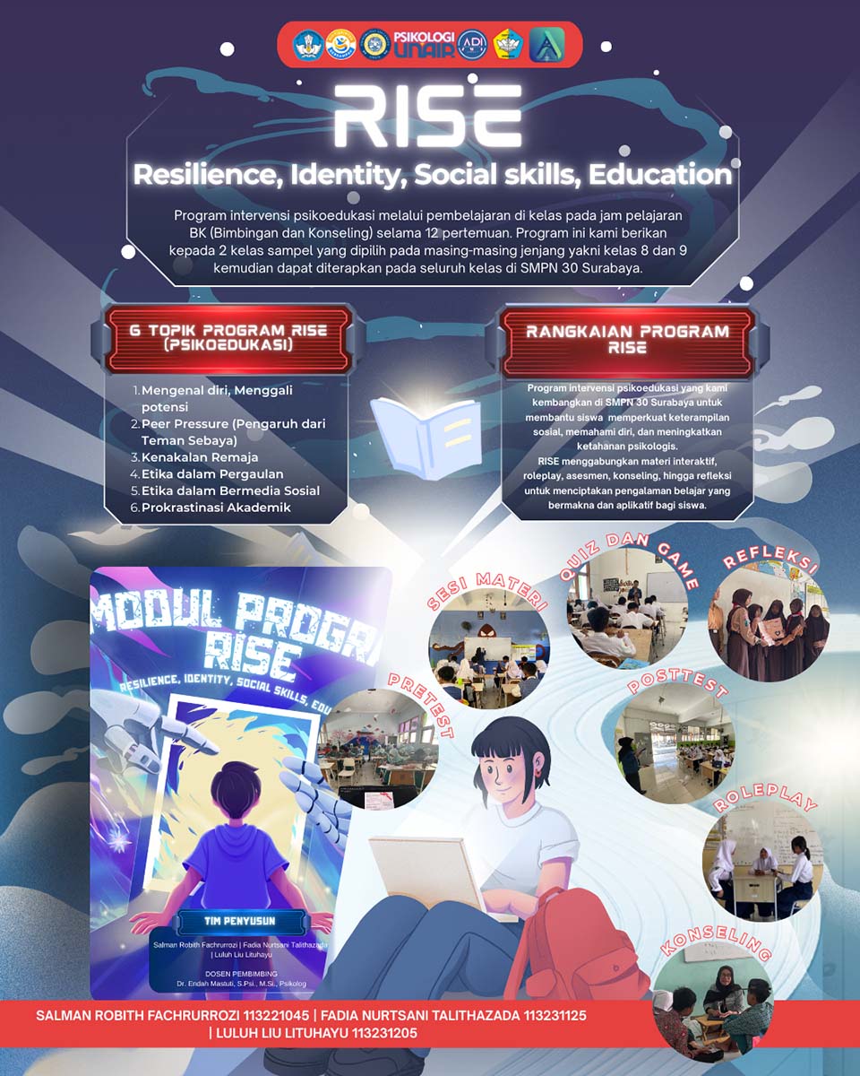 Sebagai respons terhadap permasalahan tersebut, dilaksanakan Program RISE (Resilience, Identity, Social skills, Education) sebagai bagian dari kegiatan Magang Airlangga Psych Internship yang berlangsung selama 16 pekan dimulai pada 1 September hingga 19 Desember 2025. Program ini merupakan rancangan layanan psikologis berbasis sekolah yang dilaksanakan di SMP Negeri 30 Surabaya. Kegiatan ini diimplementasikan oleh mahasiswa magang Airlangga Psych Internship yang tergabung dalam tim beranggotakan 3 mahasiswa Fakultas Psikologi Universitas Airlangga yakni Fadia Nurtsani Talithazada, Luluh Liu Lituhayu, dan Salman Robith Fachrurrozi dengan pendampingan dan kolaborasi aktif bersama guru Bimbingan dan Konseling. Guru BK dan guru mapel berperan sebagai mitra utama sekaligus narasumber pendukung, baik dalam proses asesmen awal, pelaksanaan program, maupun evaluasi kegiatan, sehingga intervensi yang dirancang selaras dengan kebutuhan nyata siswa dan konteks sekolah.