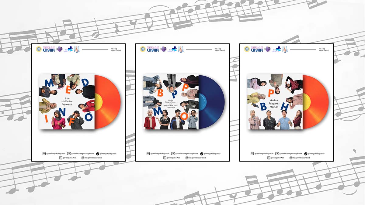 Biro Media dan Informasi BEM KM Fakultas Psikologi Universitas Airlangga pada tahun 2025 mengangkat tema “Vinyl” untuk photoshoot launching kabinet Ruang Resonansi. Pemilihan tema ini didasarkan pada filosofi bahwa vinyl adalah simbol dari suara yang autentik, hangat, dan penuh karakter. Setiap piringan vinyl memiliki alur unik yang menyimpan rekaman kisah, seperti halnya individu dalam organisasi. Saat jarum menyentuh permukaan vinyl, ia menciptakan resonansi, yakni getaran yang menyebar dan membentuk melodi yang utuh. Hal tersebut melambangkan bagaimana individu dengan kepribadian, latar belakang, dan perspektif yang berbeda dapat berpadu untuk menciptakan harmoni dalam organisasi.